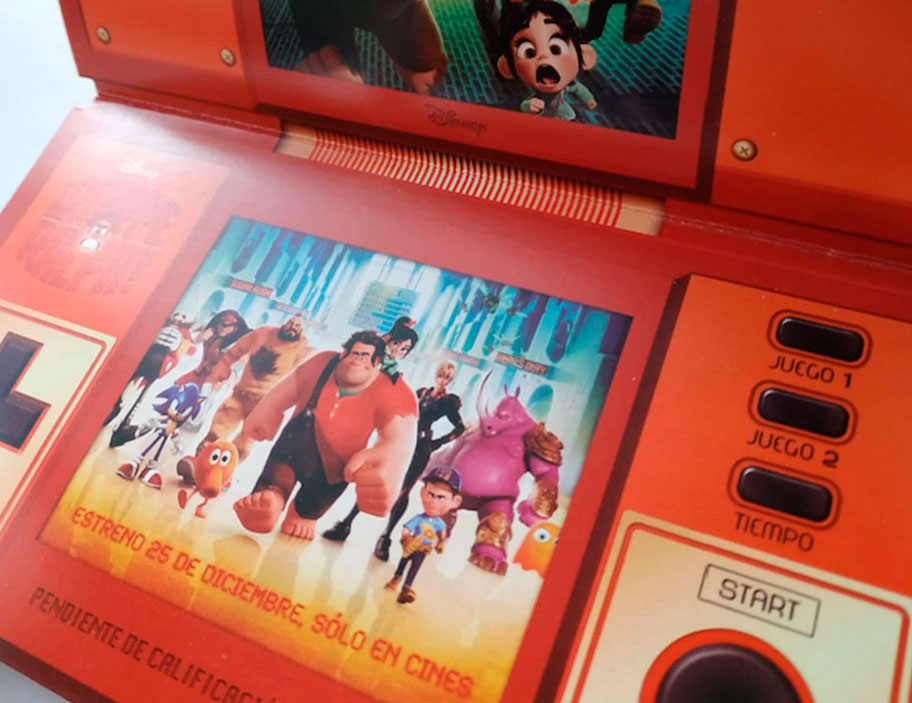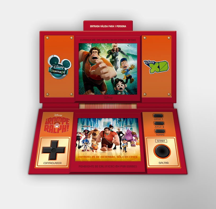 Entradas para un pase en exclusiva de la película de Disney "Rompe Ralph", dedicada al mundo del videojuego. Por ello, decidimos crear unas entradas que simularan las antiguas maquinitas de videojuegos portátiles de los 80.